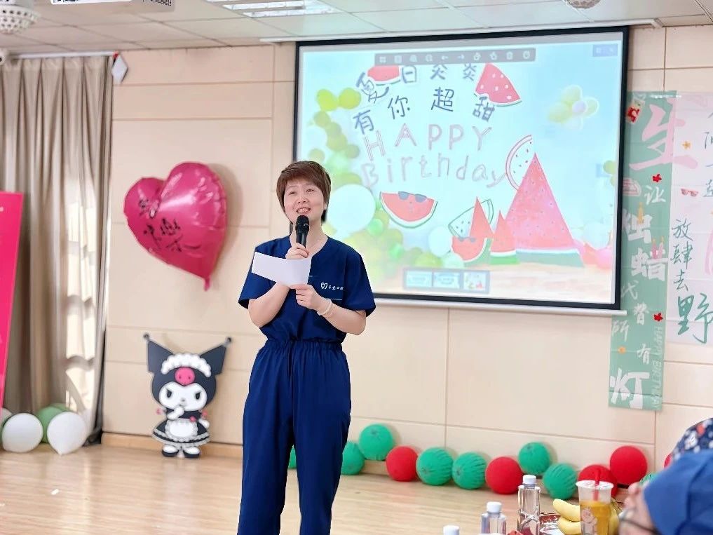 陶院上台致辞,她以风趣幽默的语气向寿星们送上了真挚的生日祝福,对大家在工作中的辛勤付出给予了充分肯定,并鼓励大家继续携手共进,为医院的发展贡献力量。