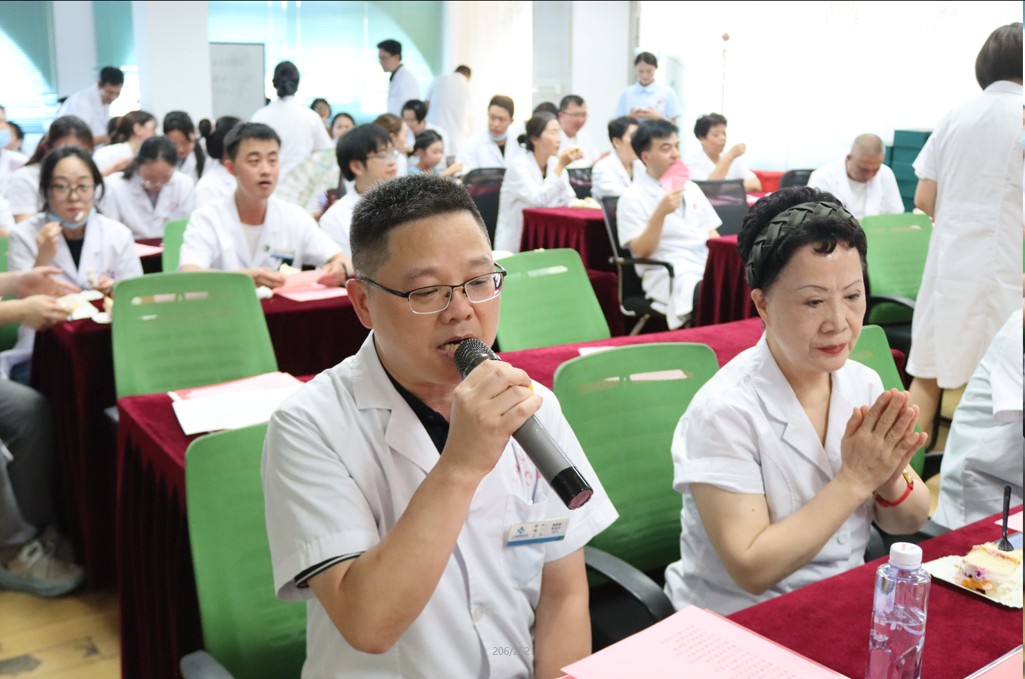 切蛋糕环节将氛围推向高潮。四四方方的蛋糕承载着领导对医师团队的关爱,也凝聚着“同心向未来”的期许。品尝着甜蜜的同时,黄主任K歌一首《精忠报国》刚劲有力的唱腔引得在场掌声不断。